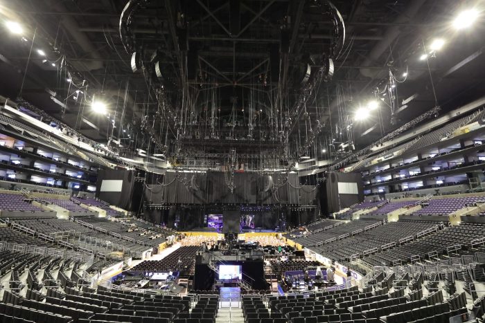 The primary delays consisted of 32 CO10 loudspeakers in four arrays of eight CO10s per array. The upper level of the arena was covered by 36 CO8 loudspeakers in six arrays of six CO8s per array.