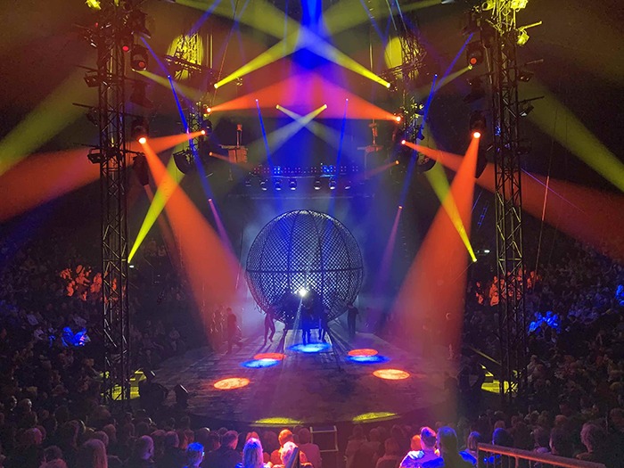 The MiniBurst strobe units were used mostly to create an effective moving stroboscope effect, which was used particularly well on the Wheel of Death and Globe of Speed – a rotating steel structure that is suspended from its axis which, at the highest point of rotation, has the artist almost reaching the tent ceiling.
