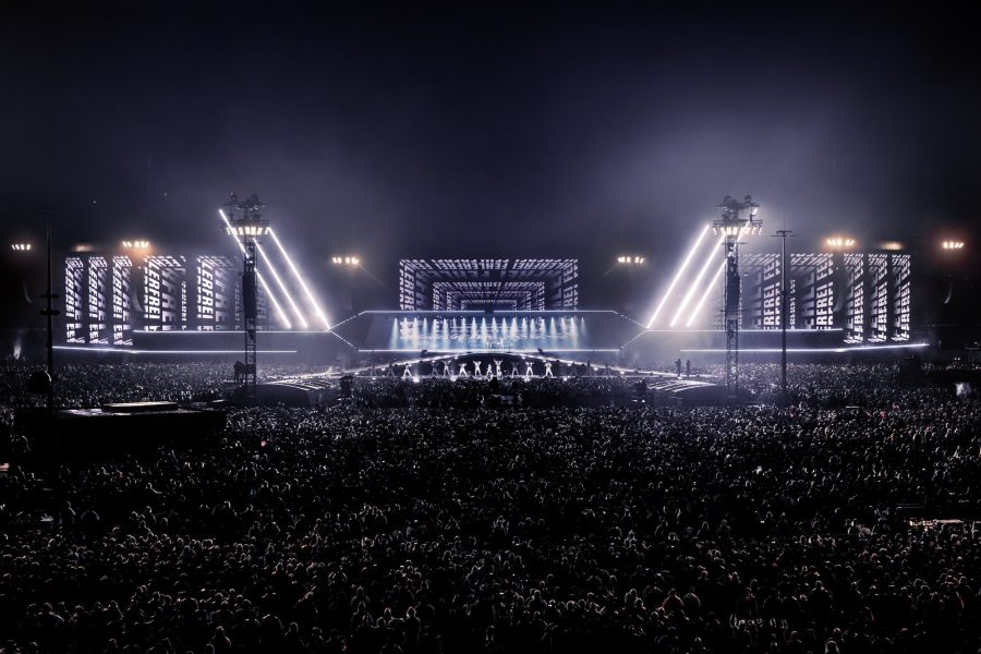 The challenge lay in the sheer scale of the site and stage. Promoter, Klaus Leutgeb wanted to give fans a stand out show with a high production value but at a stadium scale. Not only did the stage design need to have real firepower from a distance but it also needed to have its own distinct look and feel. The result was a huge 150m-wide diamond shaped stage outlined with a striking LED strip, a giant semi-transparent central LED video screen, a central bridge that acted as a band roof, 1,600 sqm of angled video screens on the wings, 1,086 lighting fixtures, 18 audio delay towers, 20 sky beams, 6 IMAG screens, and a bespoke runway and B Stage.
