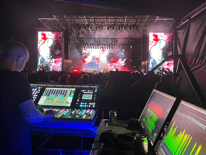 His two principal artists are very different when it comes to the live mix. “It took me a long time to learn how to mix Slipknot, just because it’s so chaotic. There are nine guys on stage and at certain times there are three drummers playing — and sometimes they’re hitting kegs with flaming baseball bats! I don’t want to say Avenged Sevenfold are easier to mix, but there’s a lot more space,” Strakele continued.