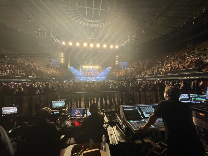 In LA, Brit Row provided the same inventory; a plethora of L-Acoustics K1, K2, KS28, Kara II, A15 and A10 with d&b audiotechnik M2 wedges. The company also deployed Sennheiser and Shure RF packages, a multitude of microphones plus Yamaha consoles for monitor world and Solid State Logic desks for the FOH mixes.
