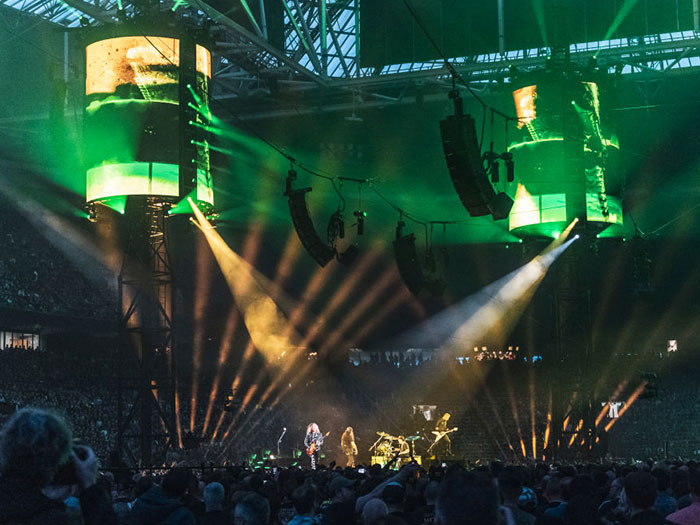 Greens and yellows dominate the colour scheme in the show’s design. “To me, green and metal music are inextricably linked,” said Koenig. “I always got a kick out of Nook Schoenfeld’s views on green, but I do wholeheartedly understand his sentiments when looking at almost any other type of performance. I certainly wouldn’t vibe with this much green on a typical pop show. As for the yellow, it’s thematic with the band’s album,” continued Koenig. “When we started putting together the tour, the thought process was we typically don’t use much yellow at all in the live shows, so it wasn’t a stretch to utilize it as a feature color to help define all of the new songs from ‘72 Seasons.’”