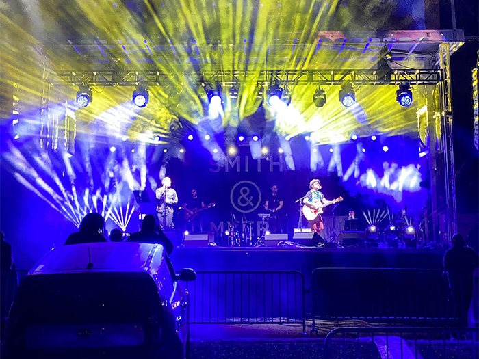 Given the acoustic nature of Smith & Myers’ music, these fixtures played a somewhat different role in Youngblood’s design than movers normally would for his more aggressive sounding clients. Rather than call forth fast and intense pan and tilt movements and dramatic sweeps, he relied more on evocative color changes to engage the drive-in crowd.