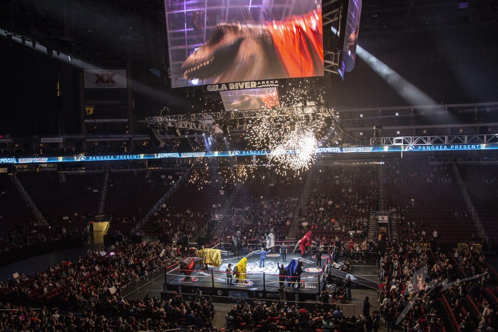 Held at the Gila River Arena outside Phoenix, the event drew an enthusiastic crowd of about 4,000 to see eerily realistic-looking dinosaurs with names like Spinecrusher Spinosaurus and Rowdy Roddy Raptor do battle in a full production setting evocative of a televised wrestling or boxing match.