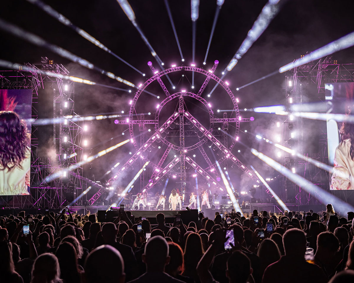 Overall production challenges for creating a colourful and vibey show that riffed with the energy of the evening included the fact that – with no stage roof (which was another aesthetic decision) – all the lighting had to be ground supported. On top of that were considerations in case of bad weather, which luckily weren’t needed.
