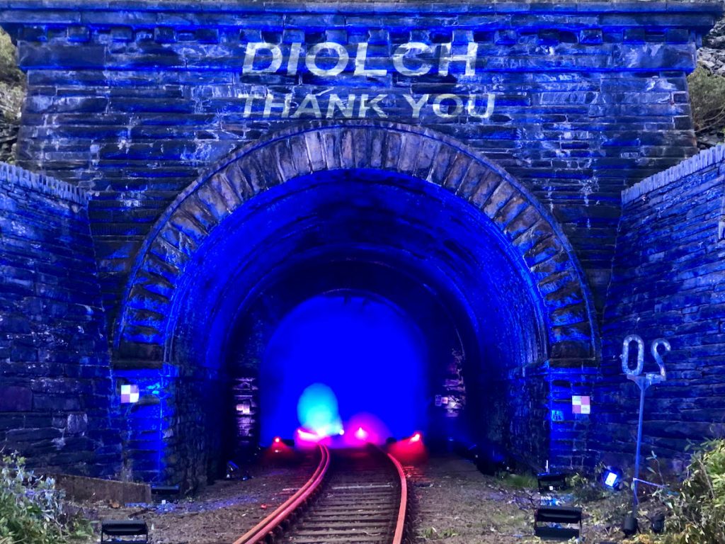 Enlightened were privileged to facilitate the team from Network Rail Wales & Borders to light the Ffestiniog Tunnels Entrance and interior to show its support and pay tribute to the NHS, UK key workers and transport colleagues working tirelessly on our behalf. Sited at the southern end of the glorious Conwyn Valley Railway line, the four kilometre long Ffestiniog Tunnel is part of Network Rail Wales and Borders.