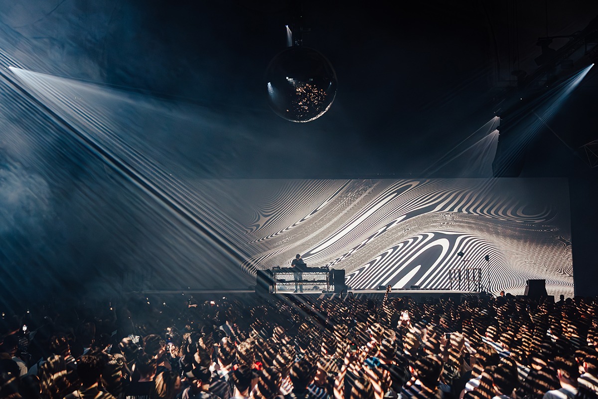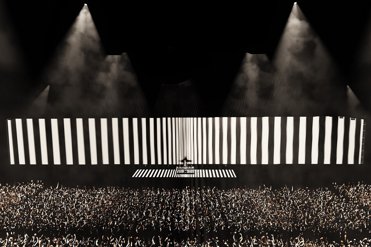 “The main element from the onset was to include the crowd in the show as much as possible. Jamie xx’s album artwork is inspired from optical illusions in black and white lines and the movement of them in negative space. This was the outlay from the beginning, so we always knew that there would be a projection element of the show. Obviously, when working with projection; the lighting has to be carefully integrated, as it’s very easy to eliminate projection with today’s brightness in fixtures.”