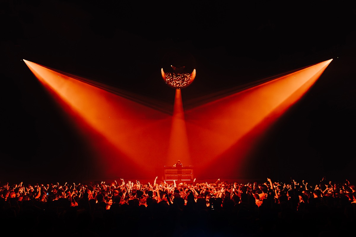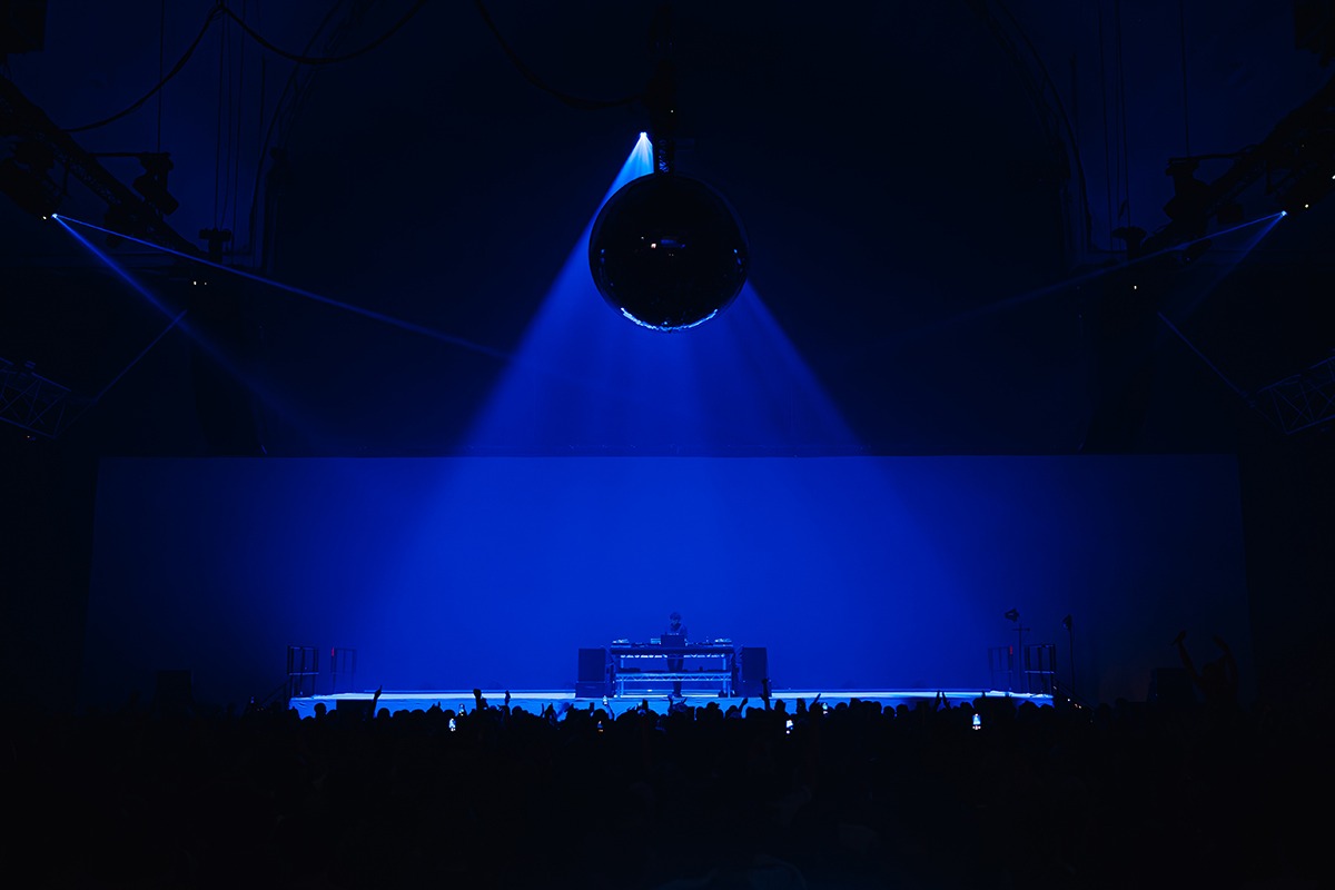 “We had some really strong looks where projection totally lead songs. From simple rippling white lines working from the centre of Jamie xx to sprawling across the room. We managed to achieve effects that just aren’t possible with any lighting fixtures. We added 20 Ayrton Cobras that were placed around the room to light the 2.2m mirrorball; one of Jamie’s statement pieces throughout all of his shows. Although we only used it for three songs, the impact always gets an applause. The Cobras also doubled up with animation wheels simulating some of the projection patterns so that we had the dynamic feel that they were an extension of the projection. We were pushing content from the Disguise media server through all of the lighting fixtures so that it would appear seamless across all the production. In addition, GLP JDC Lines were placed behind Jamie xx on the stage floor to give us a linear strobe to help accent some of his high energy music. Robe FORTEs were also situated behind Jamie xx on risers sitting just below the stage height. We didn’t want to sacrifice the clean stage aesthetic. We added some more fixtures on the room trusses to help further the overhead lighting when projection was off for some moments. Two Robe FORTE followspots were placed to light special guests, Romy and Oliver on the second night.”