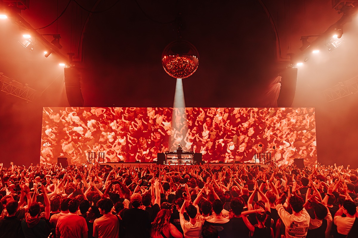 “The scrim upstage was 47m wide by 12m high. This gave us a huge cinematic style screen to project on to. It was made up of two gauzes. One of which was black that dropped on a kabuki at the start of the show in order to hide the fact that there was a projection screen behind it. When the audience entered, they walked in to a dark red room. One of the main elements of the show is crowd inclusivity so there were dancers incorporated throughout the audience that come alive during key parts of the performance, that started curating part of the storyline as we worked through the show. There are some prominent moments where the dancers are projected on to the screen by the use of robotic cameras placed on the truss. A wireless camera was manually operated in the crowd by Mechach, who followed the dancers around as they made their way through the audience, who were dancing and having the time of their lives. Slowly the crowd start realising that was all live content, and it really enhanced the energy of the show as everyone could see themselves on the huge screen behind Jamie xx.”