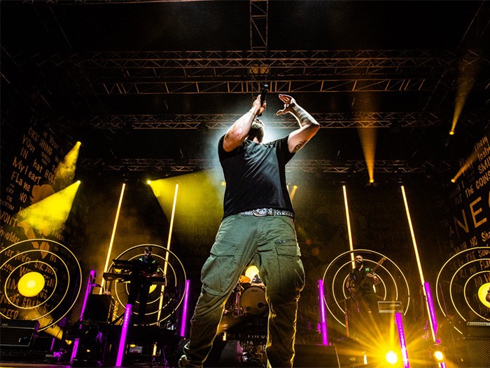 Glatthor—known for creating multilayered, haptic spaces on stage—designed a variable set with many surprizes. With the help of 60x FUSION Stick 20 fixtures from FUSION by GLP, he skilfully picked up on the NEON theme from the album and the tour. The majority of the FUSION Sticks were suspended from each other by a background truss, set in vertical rows of six each. The designer distributed Sticks asymmetrically on floor stands on the stage.