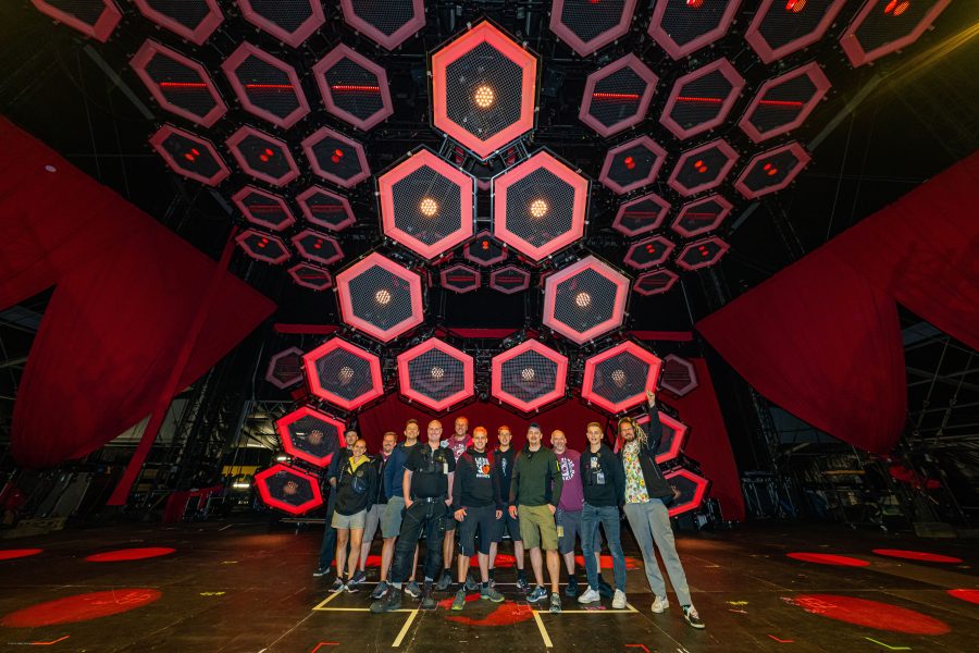 The honeycomb construction in the stage roof, which can be moved on a C1 system, was created in cooperation with schoko pro from Wiesbaden. “The honeycomb and everything hidden within it is a completely unique construction,” confirmed Bertil. The lighting in the honeycomb alone accounts for 125 DMX universes.