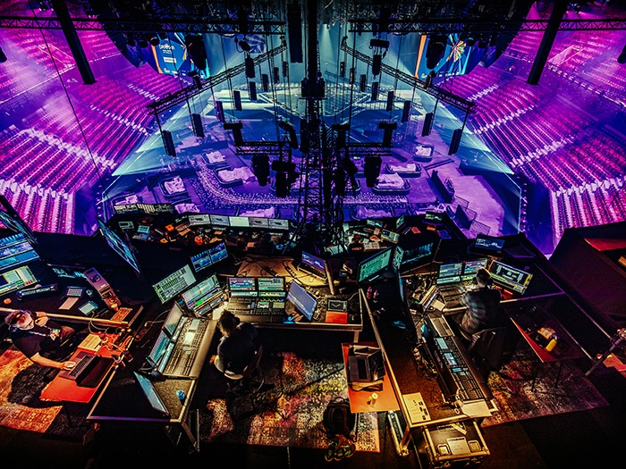 In addition to the real lights in the space, some augmented reality elements featured in the broadcast involved several virtual lights running via Art-Net. Ten grandMA3 consoles were stationed at FOH in the arena, and divided into three different sessions (main, décor / specials and key lighting), two more grandMA3 light were on the floor for focussing and technical sessions and another two were located in a studio used for offline programming.