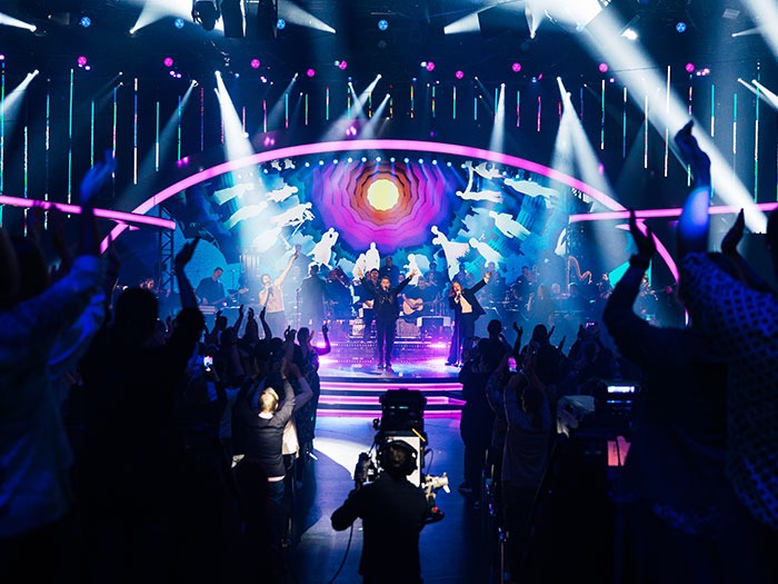 Your Songs see well-known artists sing one of their most successful tracks while enveloped in visuals and accompanied by a live orchestra. The LED Main Wall measured 16m by 5m at 4096 by 1280 pixels, while an 8m by 2.5m LED ‘Talk Wall’ displayed secondary graphics. A series of ‘gardenfence’ LED strips surrounded the stage, pumping out 12300 x 1450 pixels of graphics.