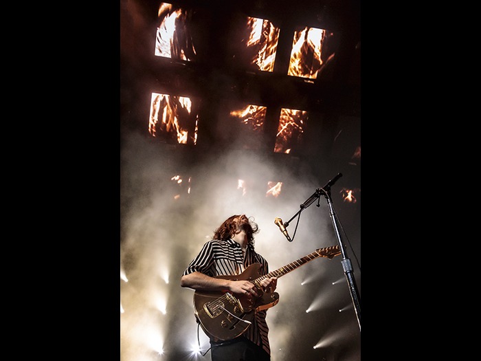 This opening stage of the global outing, in support of the band’s third studio album Evolve, comprised 31 North American dates and SRae Productions. Owned and operated by Sooner Routhier and Robert Long, a trio of Green Hippo Hippotizer Boreal Media Servers were used to control an array of 30 LED pods. Mounting the pods on a brace of automated Axis, the SRae team used 4 projectors to shoot on to physical roll drop units.