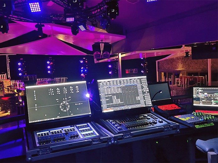 Dimitriadis arranged some of the fixtures in his rig on five totems behind the DJ booth, spacing them out to preserve the sea view. Other fixtures were positioned on overhead hang points as well as on each side of the booth. This allowed him to hit the DJ and the widely separated tables on what would normally be the dance floor with an immersive web of light from every direction.