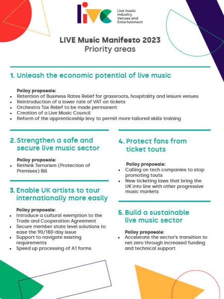 Jon Collins, CEO, LIVE, said: “The LIVE Music Manifesto launched today presents a huge opportunity for our political leaders to supercharge a cultural and economic powerhouse. It is estimated that for every 10,000 people at a gig in the UK, there is an additional £1 million spent in other local businesses including restaurants and bars, transport networks, shops, and hotels. It’s crucial that the voice of the live music sector is heard at the next General Election. Simple interventions, like the extension of the business rates relief and a return to lower VAT to bring the UK into line with international competitors would transform the sector. There are also grave risks to inaction. We need to wake up to the reality that the grassroots venues where artists like Ed Sheeran and Adele honed their craft are closing at an alarming rate. We need urgent action from government now, or we risk losing out on future generations of British superstars.”