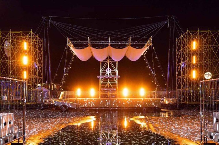 For the re-awakening of the Woodstock feeling, Megaforce constructed a tower stage with a space requirement of 27.5 x 10 metres, consisting of yellow steel in the Woodstock look with a roof that is completely open. For this, the Megaforce construction team developed a free-floating traverse roof made of wood and metal with beige canvas.