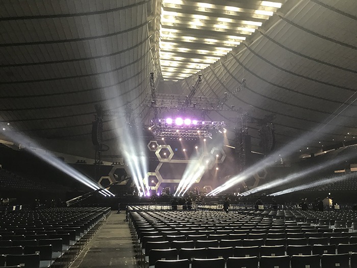 Hote described his design philosophy: “First of all, we had little time for set-up, starting at midnight when the load-out of the last show had finished. The H-shaped tower was reused from the previous show, just changing the location of the motor. In Yoyogi National 1st Gymnasium, it is necessary to build stand-alone towers from the ground, as the roof weight is strictly regulated. After considering those factors, this location plan seemed to be the best.”