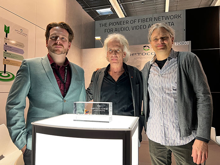 The presentation to Bill and Brandon Coons was made by Optocore founder, Marc Brunke, during the ISE2024 expo in Barcelona recently.