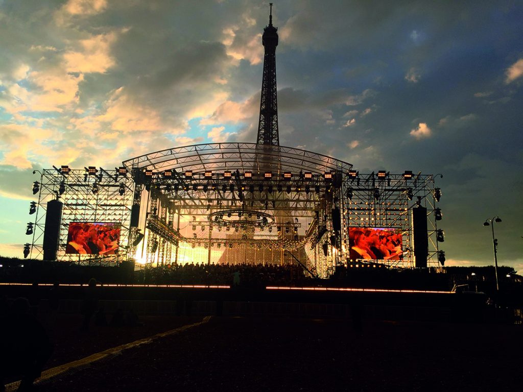 The Grand Concert de Paris, celebrating the anniversary of the storming of the Bastille, takes place every 14 July at the foot of the Eiffel Tower, in the Champ de Mars. This year, a crowd of 300,000 people assembled to listen to the concert live, while a record audience of 3 million viewers tuned in to watch the spectacle on television.