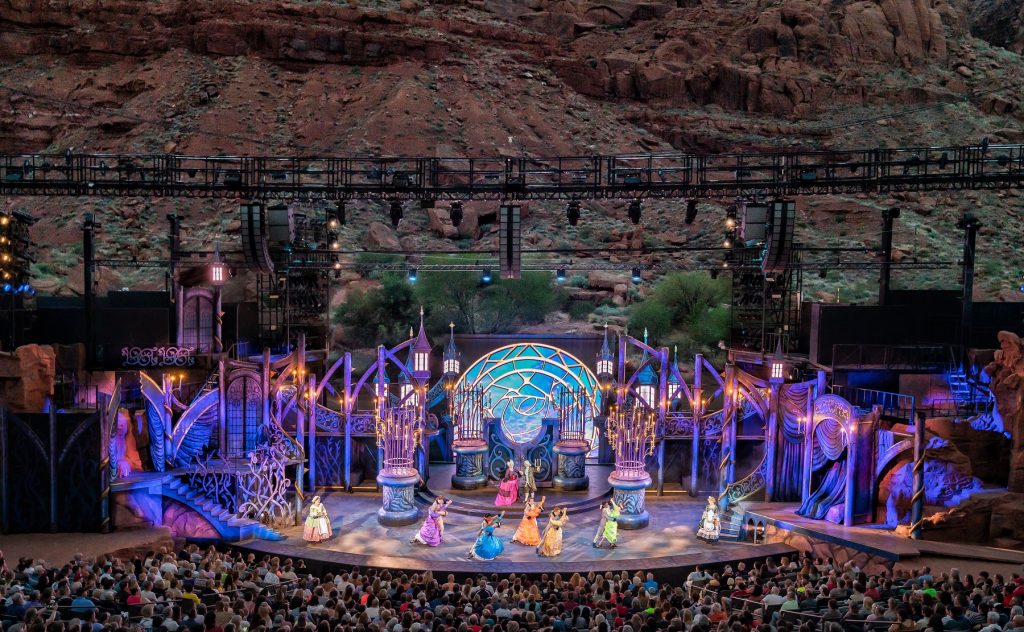 Set against a magnificent red rock canyon backdrop in the Utah desert, Tuacahn Amphitheater in the state’s southwest corner is one of the most picturesque settings you’ll find anywhere for outdoor theatre. Lighting Designer, Cory Pattak recently lit a production of Beauty and the Beast amid the spectacular surroundings and used the venue’s new IP65-rated Proteus Maximus moving heads as workhorse front light fixtures.
