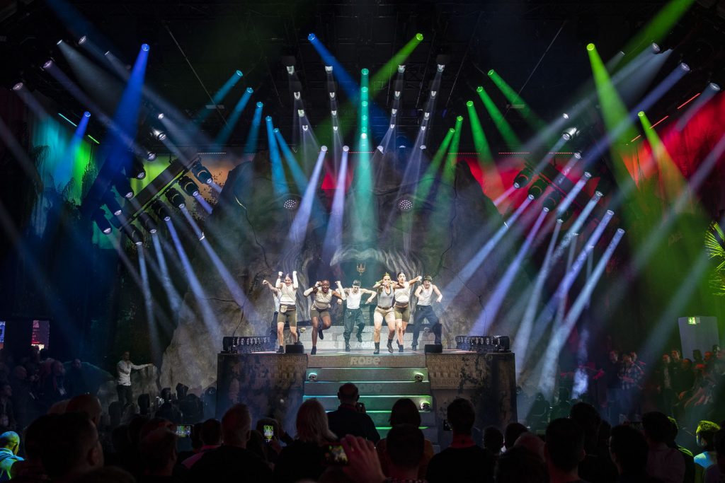 His starting point was the pool design surrounding the stage, specifically modelled so the iPointes could get a good soaking and have the best impact on the show treatment. Above the stage was a matrix of 4×4 SilverScans – a vibrant centrepiece programmed to show off their incredibly fast movement, potent output and array of animated funky effects – harking back to the pioneering glory days of the underground rave scene in the 1990s.