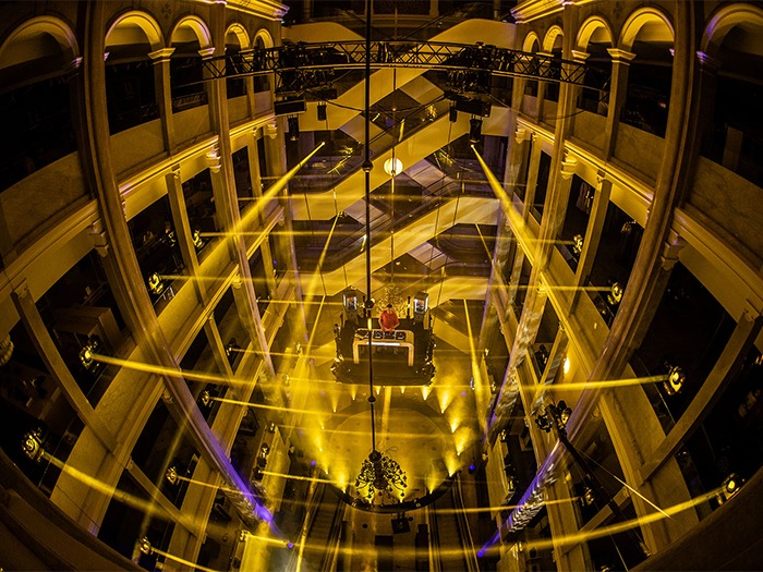Copenhagen’s ILLUM luxury department store was the pop-up location for the final show of this series thus far. DJ decks were set up on a platform flown in the middle of the space, 16m off the floor. To accentuate the interior, Skall used 86 Robe Spiider LED wash beams positioned on flightcases deployed around the ground and first three floors. A total of 16 MegaPointes were set up in a circle on the floor below the flown DJ riser. A pair of Robe BMFL Spots situated below were used to shoot gobos all around the atrium.