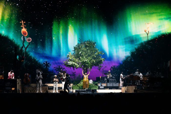 The set on Batiste’s stage reflected the rich diversity and creative spirit of his music, with a tree in the middle of the stage, a clothesline to the left, a recording studio to the right, and a utility pole thrown in for good measure.