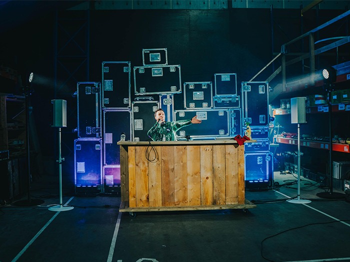 Although the lockdown is still very much in place, the cases are now playing a new role in bringing entertainment to the people. This time as backdrops in the improvised livestream studio that Sound&Co has set up in its 1,200 square meter facility.