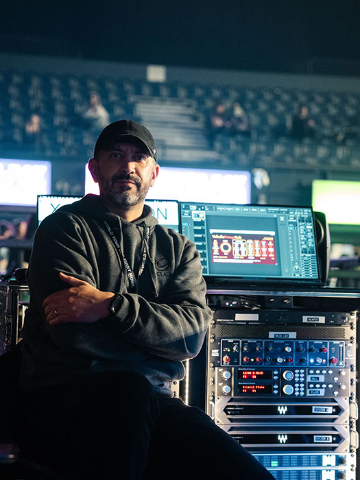 Tarazona’s setup for the XG tour includes a DiGiCo Quantum 338 + SD Rack 56×40 (32bit cards), a Waves DMI-Waves card (for recording) and two Waves SuperRack LiveBox Dante units.
