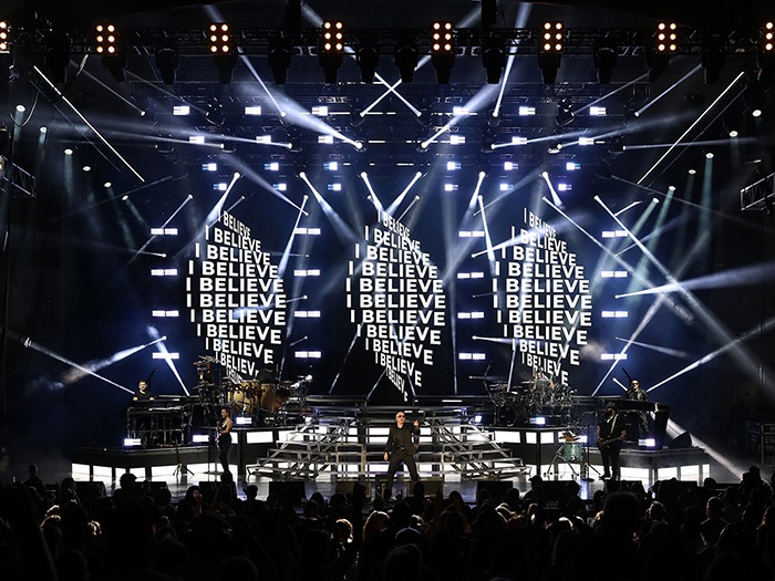 The collective efforts of the design team created an abundance of memorable looks. For Yamil, a visual high point occurs during the song Time Of Our Lives, when the video wall – created in collaboration with Kyo Production Design – shows a vivid 3D rendition of a “cryptex” spinning as it forms positive written messages. “With everything the world has gone through this messaging is uplifting,” said Yamil, noting that it “inspires hope in the future.”